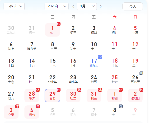 根據(jù)《國(guó)務(wù)院辦公廳關(guān)于2025年春節(jié)假日安排的通知》,結(jié)合我司實(shí)際情況,據(jù)此對(duì)放假調(diào)休原則作進(jìn)一步優(yōu)化和完善:春節(jié)自1月23日(臘月二十四、周四)至2月4日(農(nóng)歷正月初七、周二)放假調(diào)休共12天;